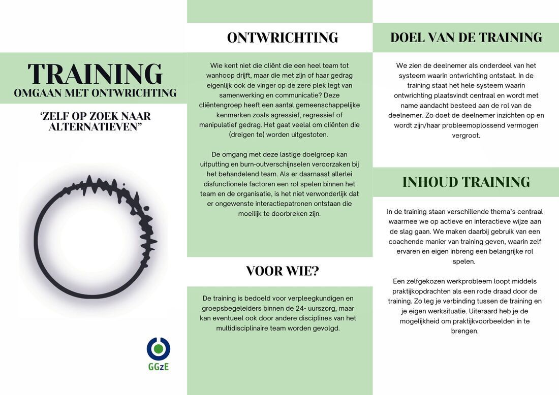 De training 'Omgaan met ontwrichting' is een 5 daagse training die landelijk gegeven wordt in Eindhoven. Daarnaast zijn er mogelijkheden om de training op maat incompany aan te bieden op locatie. De training is bedoeld voor verpleegkundigen en groepsbegeleiders binnen de 24-uurszorg, maar kan eventueel ook door andere disciplines van het multidisciplinaire team worden gevolgd.
